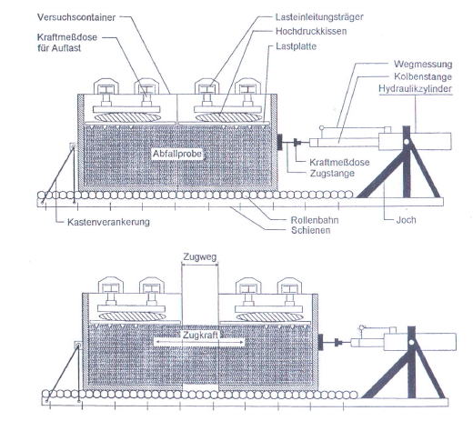 Einbau und Belastung einer Abfallprobe Auseinanderziehen der Probe Messung von Normal- und Zugspannung Wiederholen des Versuches bei unterschiedlichen Auflasten
